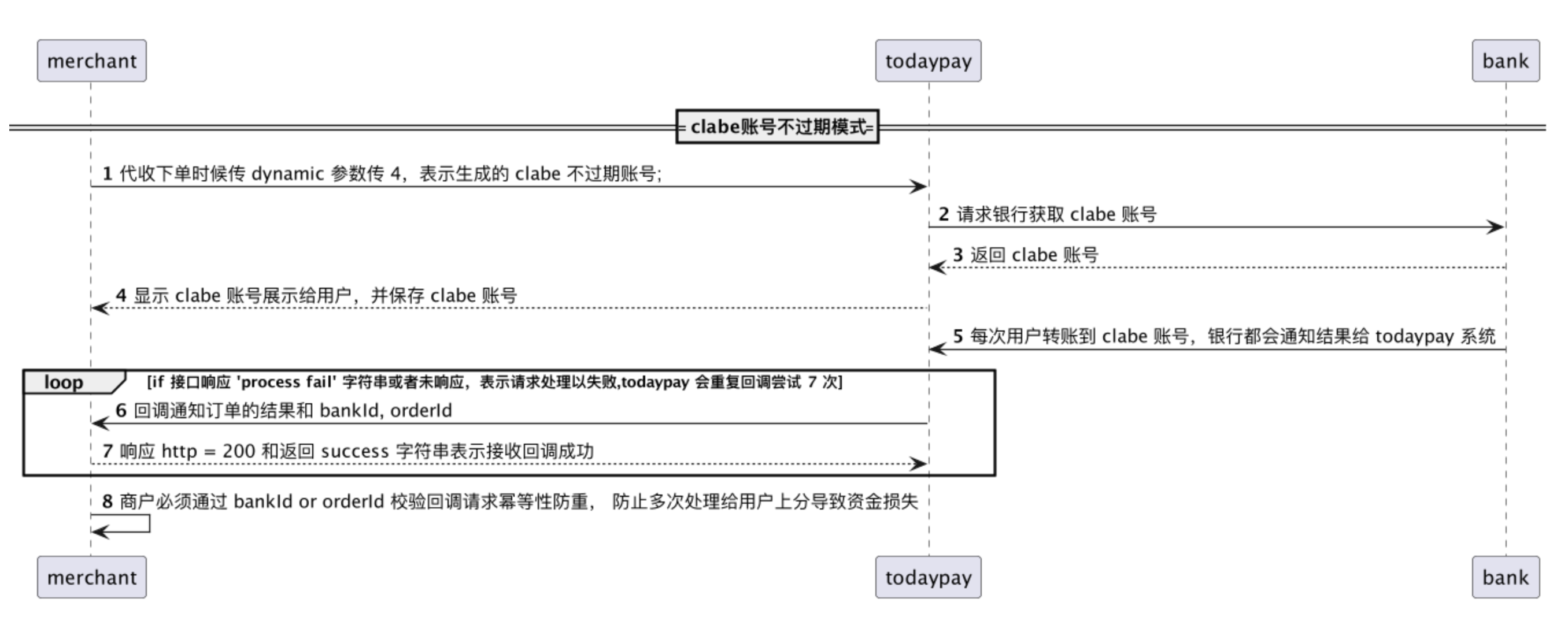dynamic = 4,当用户保存clabe账号多次支付支付成功,回调参数通知中包含区分每笔实际支付的金额 realAmount,初始下单的商户订单号 mchOrderId ,每笔支付订单的 bankId 唯一,可以作为防重和生成新单的防重单号,商户必须对 bankId 做防重校验,实际回调案例如下: